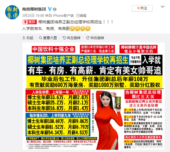 3月25日,海南椰树集团官方微博发布一则正副总经理学校再招生信息,内容包括:“毕业后包工作,升任集团副总后年薪108万,有贡献就奖励600万海景房,甚至1000万的别墅,奖励分红股权。”并有“入学就有车、有房、有高薪、肯定有美女帅哥追”等表述。