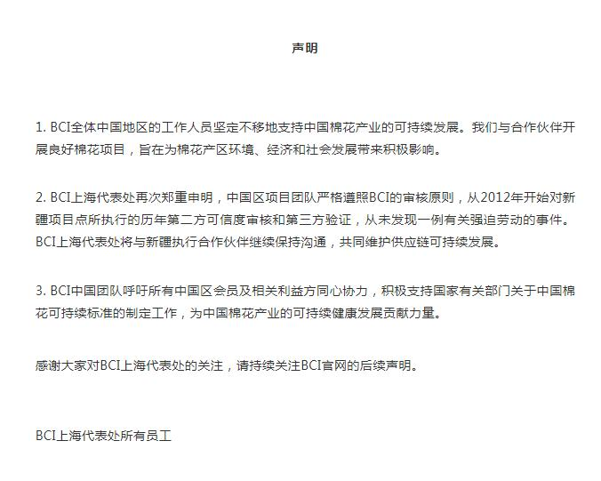 2. BCI上海代表处再次郑重申明,中国区项目团队严格遵照BCI的审核原则,从2012年开始对新疆项目点所执行的历年第二方可信度审核和第三方验证,从未发现一例有关强迫劳动的事件。BCI上海代表处将与新疆执行合作伙伴继续保持沟通,共同维护供应链可持续发展。