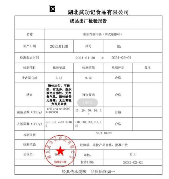 情况说明称,良品铺子低脂鸡胸肉肠自2020年8月上市以来,产品质量稳定。经查该消费者购买的20210130批次产品工厂内部成品出厂检验报告合格。该产品20201109批次由外检机构武汉谱尼科技有限公司检验合格。